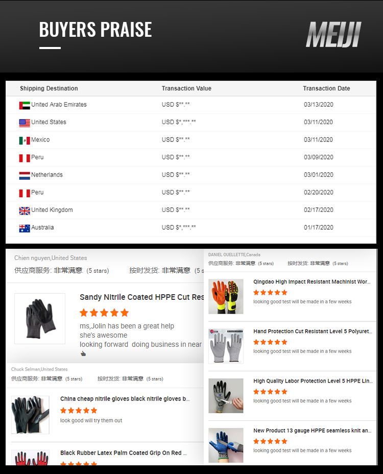 Qingdao Meiji Labor product Co., LTD., founded in 2010, after years of rapid development, the company has developed into a set research and development, trade, production into an organic whole, the specialty is engaged in the export business of work gloves in China,like cotton gloves,latex gloves,nitrile gloves,leather gloves..etc